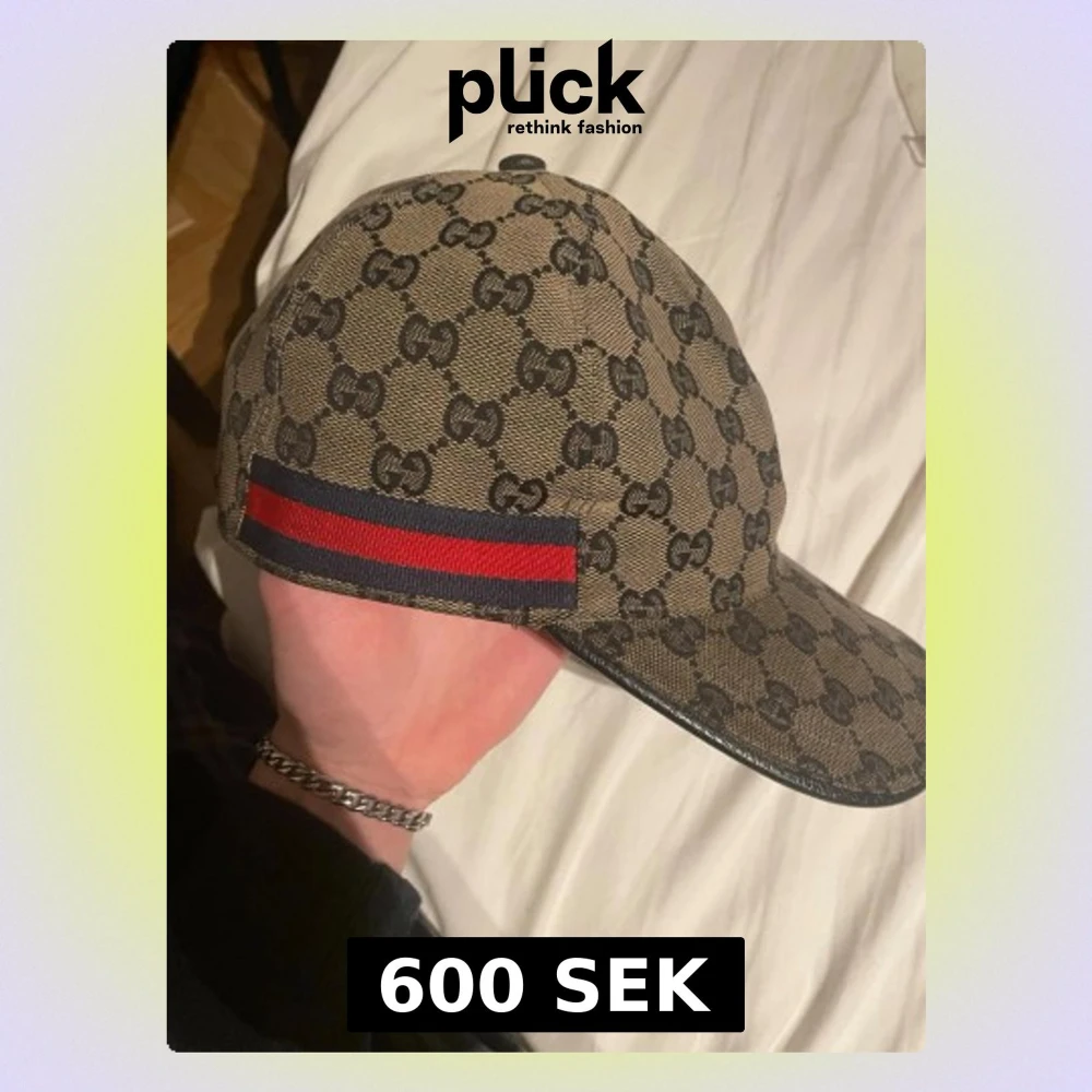 Säljer en beige keps från Gucci med det klassiska GG-monogrammet över hela kepsen. På sidan finns en ikonisk röd och marinblå rand. Kepsen har böjd skärm och justerbar rem bak. Materialet är canvas med detaljer i läder.