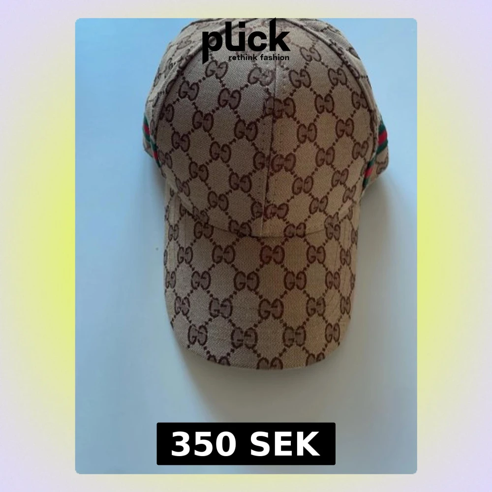 Säljer en beige keps med det klassiska GG-monogrammet över hela kepsen. På sidan finns en grön och röd rand som ger extra lyxig känsla. Kepsen är tillverkad i canvasmaterial och har böjd skärm. Perfekt för dig som vill ha en ikonisk accessoar.