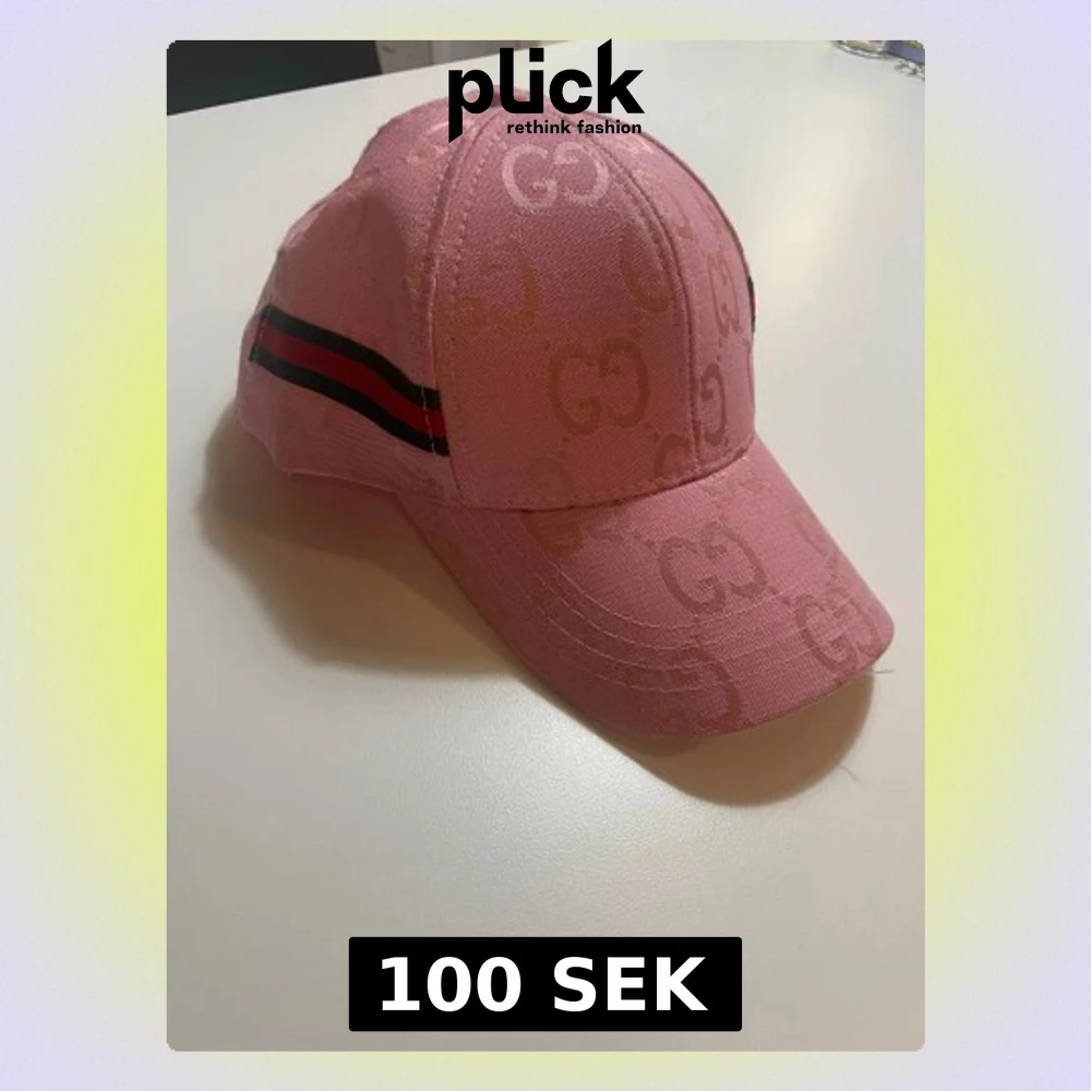 Säljer en rosa keps från Gucci med det klassiska GG-mönstret över hela kepsen. Kepsen har en böjd skärm och en svart-röd rand på sidan som ger en sportig touch. Tillverkad i tygmaterial och perfekt för dig som vill sticka ut.