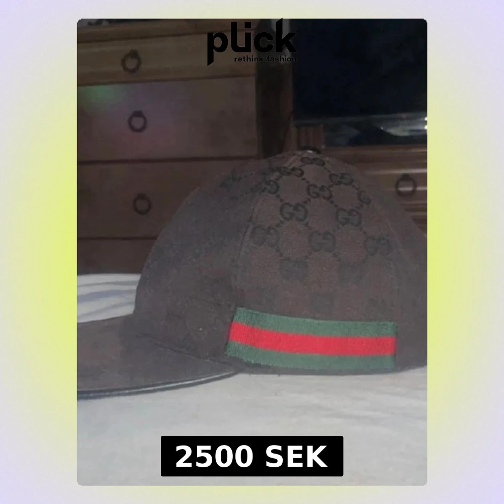 Säljer en svart keps från Gucci med klassiskt GG-monogram över hela kepsen och en grön-röd rand på sidan. Kepsen har böjd skärm och justerbart spänne bak i läder. Materialet är tyg och detaljerna ger en lyxig känsla. Perfekt för dig som gillar exklusiva accessoarer.
