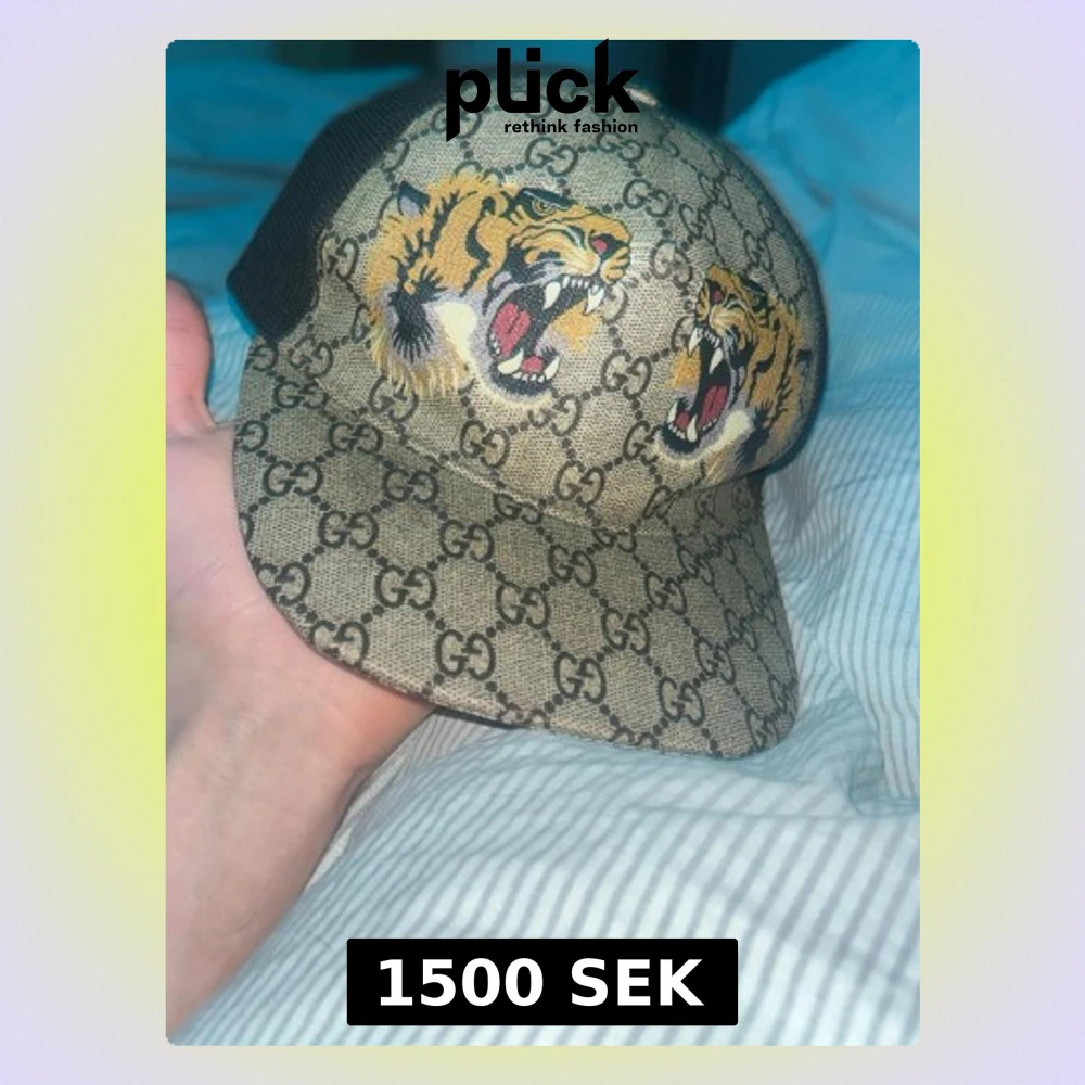 Snygg Gucci keps med klassiskt GG-mönster i beige och brunt, prydd med två tigrar framtill. Baksidan är svart mesh med justerbart band i grönt och rött. Perfekt för dig som vill sticka ut med en exklusiv accessoar.