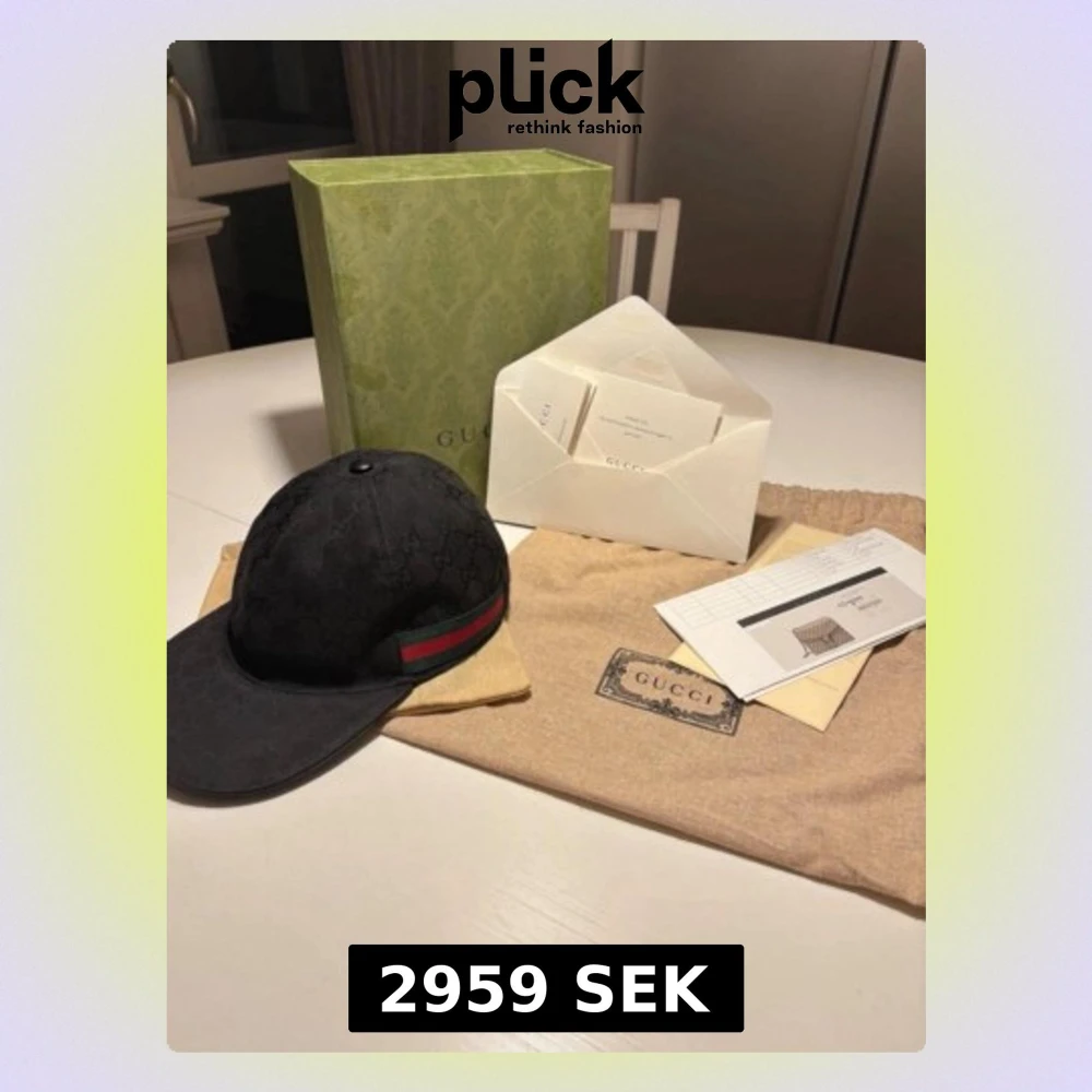 Svart keps från Gucci med diskret GG-monogram över hela tyget och klassiska gröna och röda ränder på sidan. Kepsen har böjd skärm och justerbar rem baktill. Kommer med originalförpackning och dustbag.