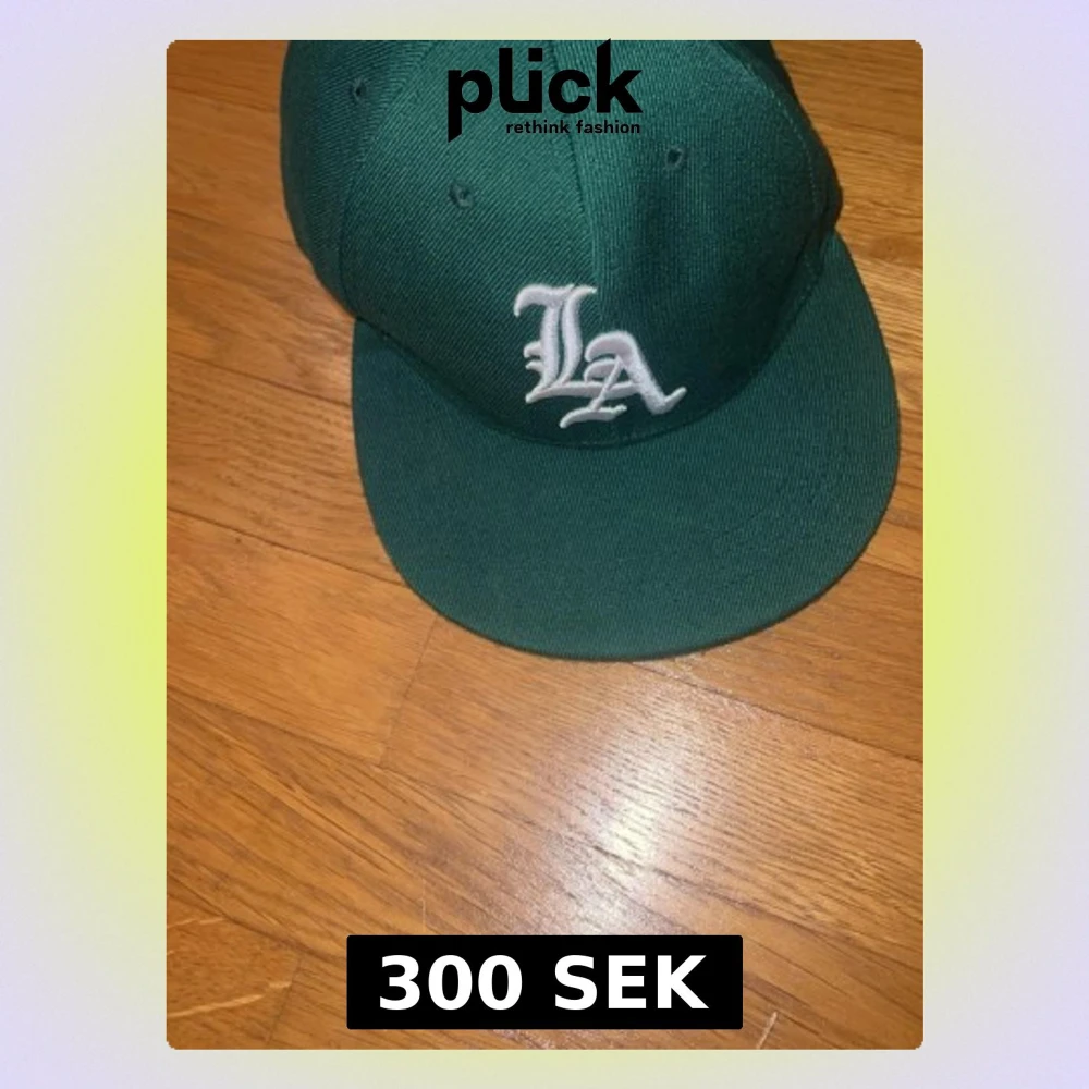 Säljer en mörkgrön keps med vit LA-logga framtill och rak skärm. Klassisk snapback-modell i bomullstyg, perfekt för dig som gillar streetwear och sportig stil. Kepsen har broderade ventilationshål och justerbar passform baktill.