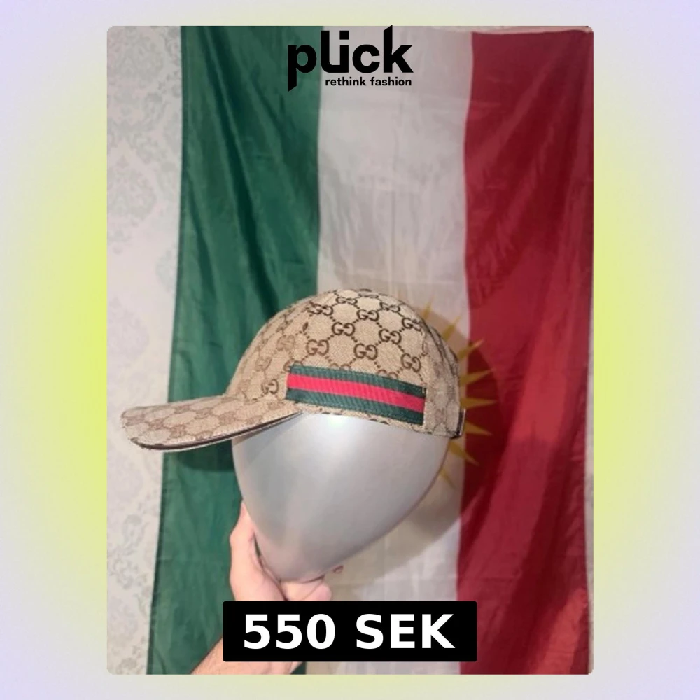 Säljer en beige keps från Gucci med det klassiska GG-monogrammet över hela kepsen. På sidan finns en grön och röd rand som signaturdetalj. Kepsen har böjd skärm och justerbar rem bak. Materialet är canvas med läderdetaljer.