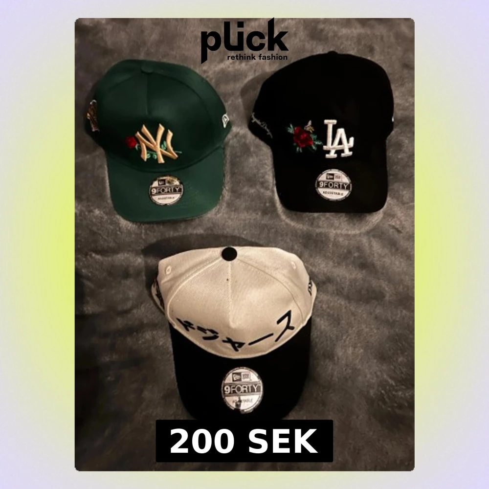 200kr per keps ! Tre snygga New Era 9FORTY kepsar: en grön med NY-brodyr och ros, en svart med LA-brodyr och rosdetalj samt en vit/svart med japansk text. Alla har böjd skärm och justerbar passform. Perfekt accessoar för att lyfta din streetwear-stil.