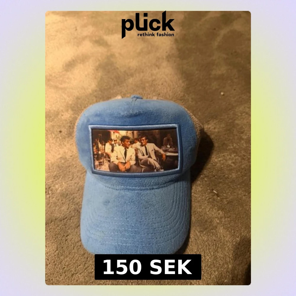 Snygg blå keps med mesh på sidorna och bak, samt ett tryck framtill med motiv av personer i kostym. Kepsen har en böjd skärm och justerbar passform. Märket Mads är broderat på sidan. Perfekt för dig som vill sticka ut med en unik accessoar.