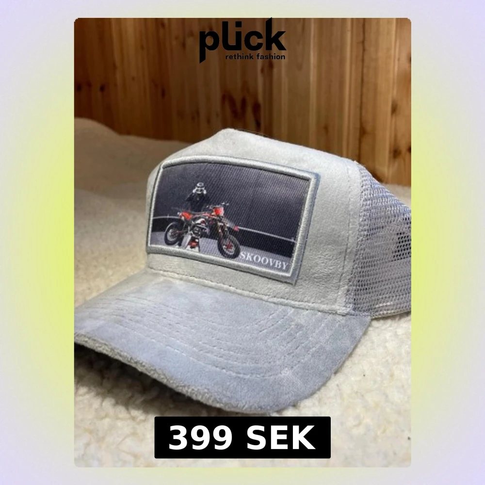 Säljer en grå truckerkeps från Skoovby med mesh på sidorna och baksidan. Framtill finns en stor patch med motiv av en motorcykel och förare. Kepsen har böjd skärm och justerbar snapback. Perfekt för dig som gillar streetwear och coola detaljer. Inte mycket andvänd!