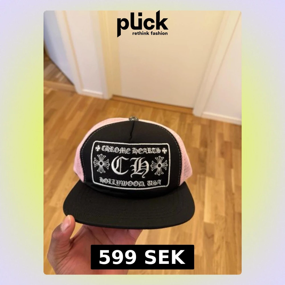 Säljer en snygg CH keps med svart front och rosa mesh på sidorna. Kepsen har en rak skärm och ett stort broderat märke framtill med texten Hollywood, USA' och CH-logga. Justerbar baktill för perfekt passform.