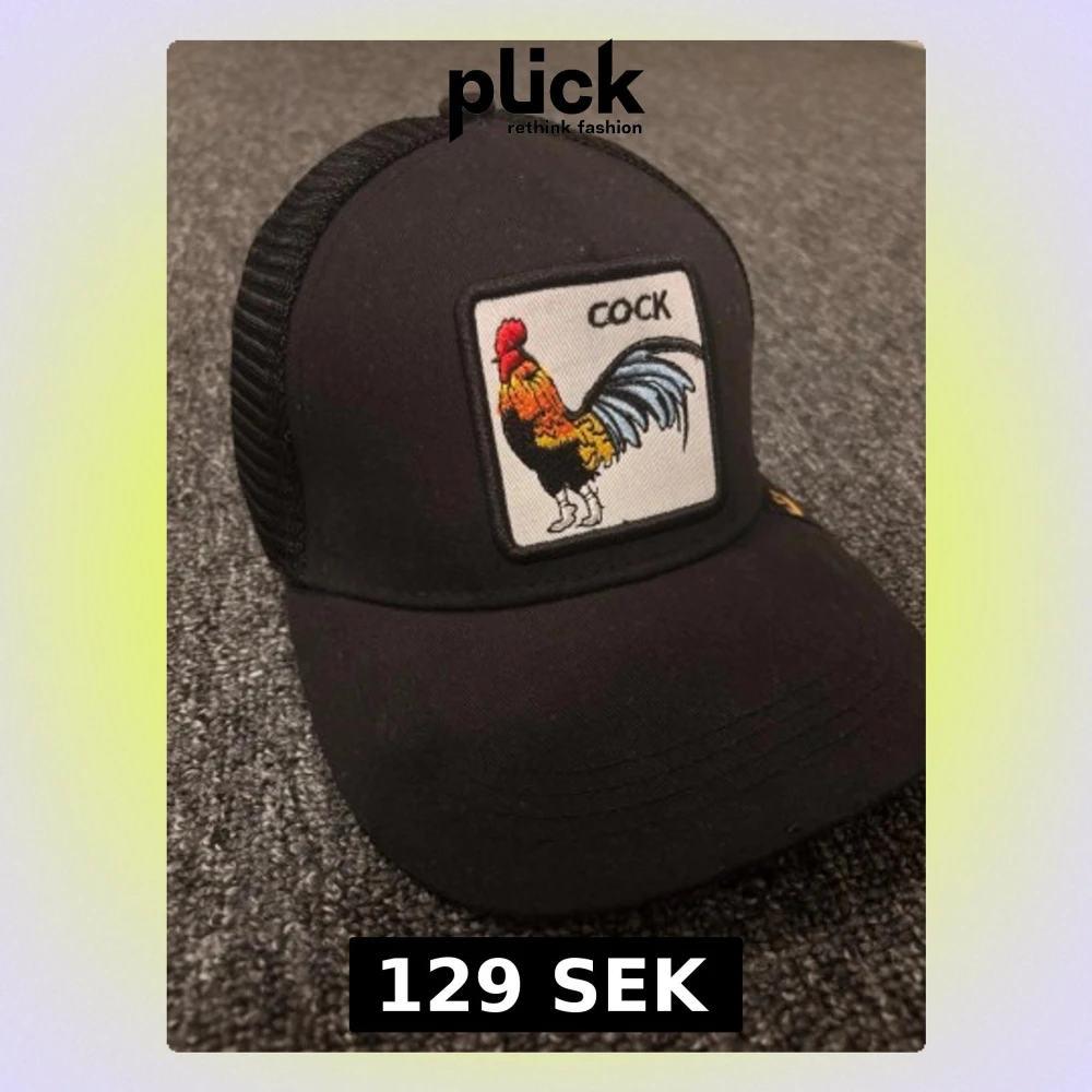 Säljer en svart truckerkeps med mesh baktill och ett broderat märke framtill med en färgglad tupp och texten 'COCK'. Kepsen har böjd skärm och justerbar snapback. Perfekt för dig som vill sticka ut med en cool accessoar, från Goorin Bros. Äkta