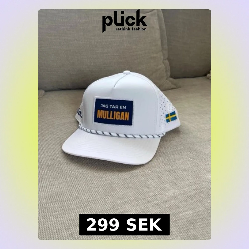 Vit keps med blå och gul patch där det står 'Jag tar en Mulligan'. Kepsen har perforerade sidor för ventilation, broderad svensk flagga och texten Golfio.se på sidan. Dekorativt snöre framtill och böjd skärm. Perfekt för golfbanan.