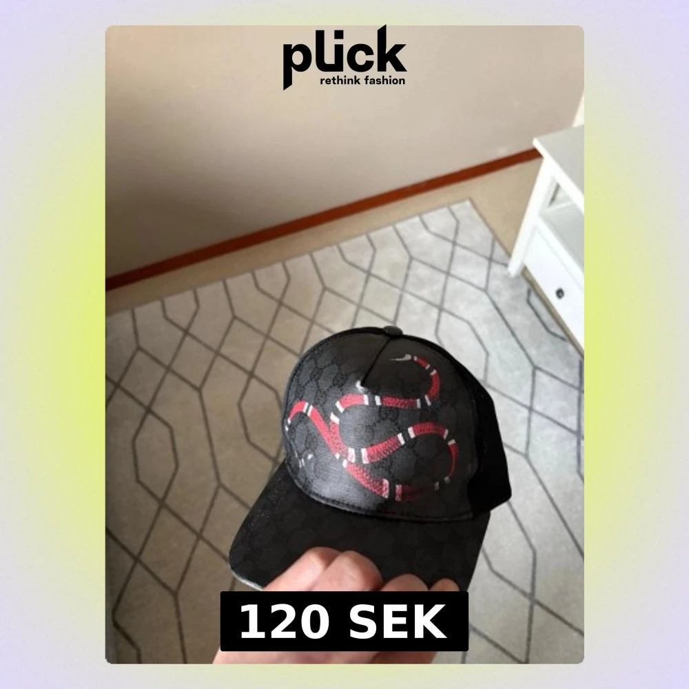 Säljer en svart keps från Gucci med det klassiska GG-mönstret och en röd-vit orm på framsidan. Kepsen har böjd skärm och mesh på sidorna för extra ventilation. Perfekt för dig som vill sticka ut med en lyxig accessoar.