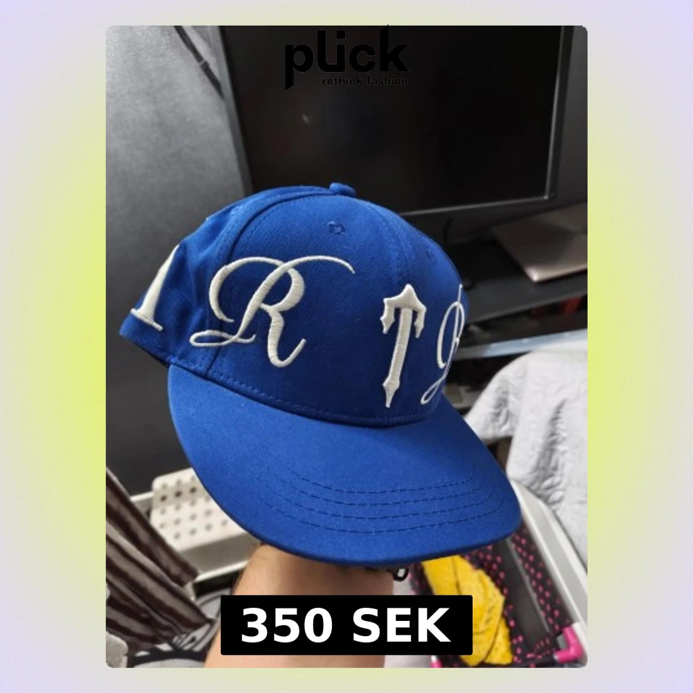 Snygg blå snapback-keps med stor, vit broderad text runt hela kepsen. Klassisk platt skärm och justerbar baksida. Perfekt för dig som vill sticka ut med en streetwear-look. Materialet är bomullstyg och kepsen har en modern, ungdomlig vibe.