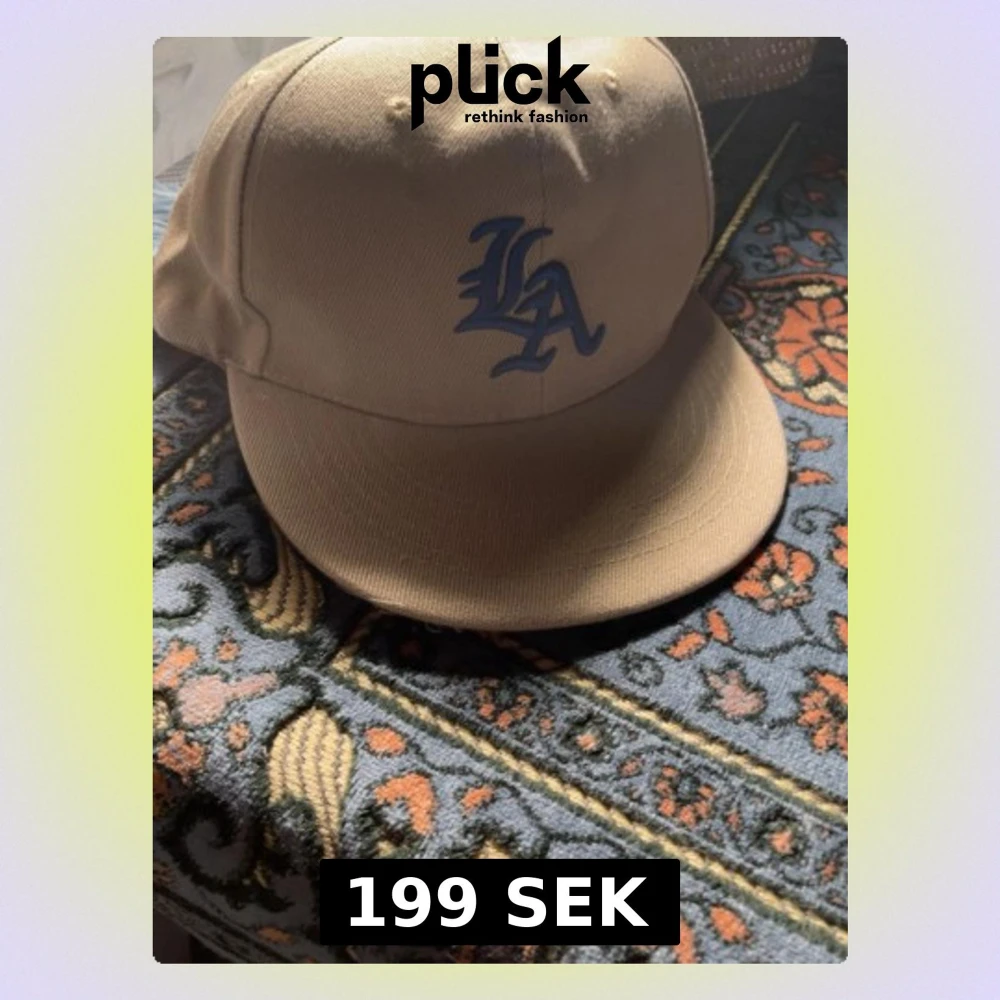 Säljer en beige keps med blå LA-logga broderad framtill. Klassisk rak skärm och justerbar baksida. Tillverkad i slitstarkt tyg, perfekt för dig som gillar streetwear och sportig stil.