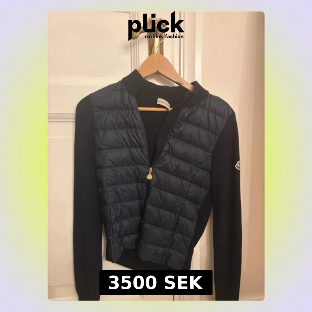 Snygg mörkblå cardiganjacka från Moncler med quiltad front och stickade ärmar. Jackan har dragkedja framtill och en liten Moncler-logga på ärmen. Perfekt för våren och hösten. (Den är i barnstorlek men jag som är 167 passar den för men lite tajt runt magen💗) Skulle säga att den passar någon som har xs. Den är använd men de syns knappt förutom att moncler loggan vid nacken har lostnat lite! Har tyvärr inte kvar äktahetsbevis men skickar gärna när jag screenar qr koden igen😊