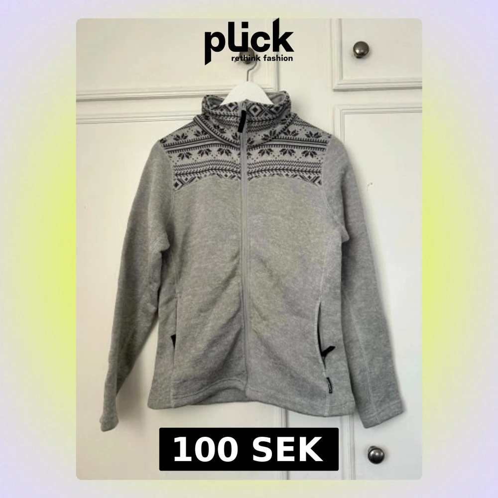 Mysig grå fleecejacka med dragkedja och svartvitt nordiskt mönster över axlar och krage. Jackan har hög krage, två fickor med dragkedja och lång ärm. Perfekt för kyliga dagar och enkel att matcha med andra plagg.