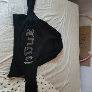 Den är 65 centimer från toppen av luvan till magen.Det står ANGEL på ryggen och kristallerna sitter väldigt bra och är knappt använd ❤️