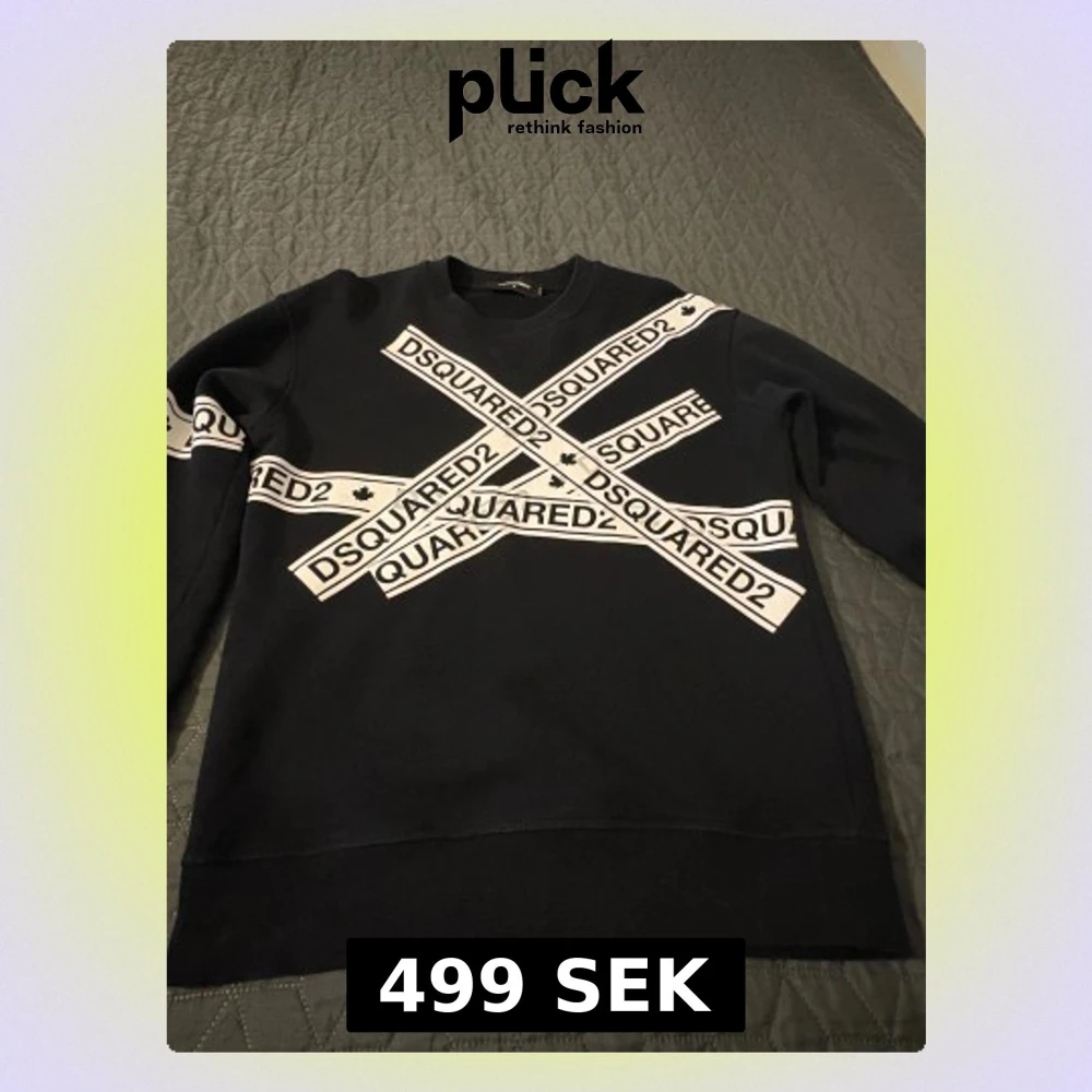 Svart sweatshirt från Dsquared2 i storlek S med vita bandtryck över bröstet och ärmen där det står DSQUARED2. Tröjan har rund hals, lång ärm och är gjord i mjuk bomull med insida i fleece. Snygg och streetig look med tydlig logga framtill.