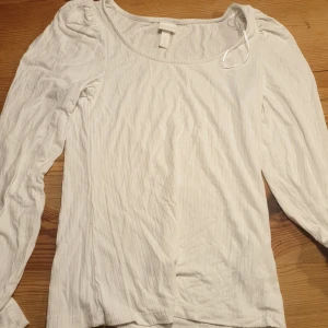En vit långärmad tröja med lite puffigt på axlarna och den är även lite uringad som man ser. Från HM.