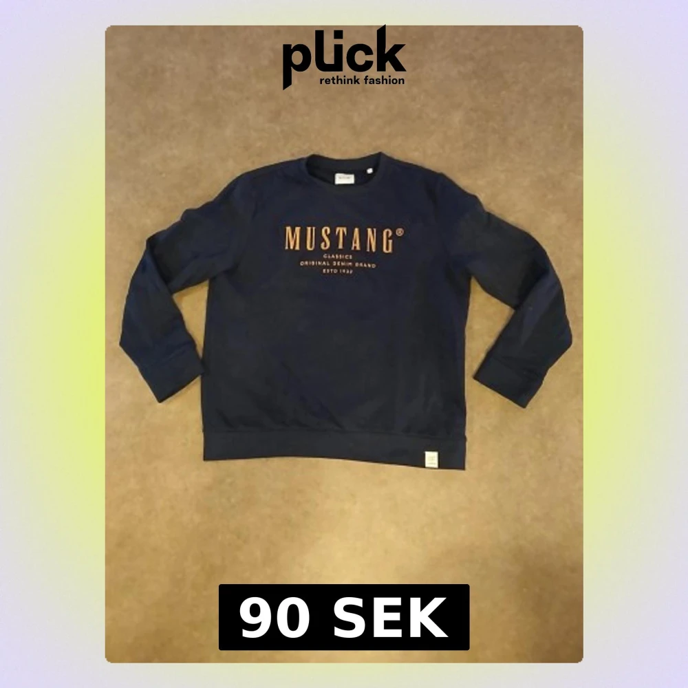 Säljer en mörkblå sweatshirt från Mustang med tryckt logga i gult på bröstet. Tröjan har rund hals, långa ärmar och ribbade muddar vid ärmslut och nederkant. Materialet är mjuk bomull, perfekt för chill dagar. Finns en liten etikett nedtill med Mustang-tryck.