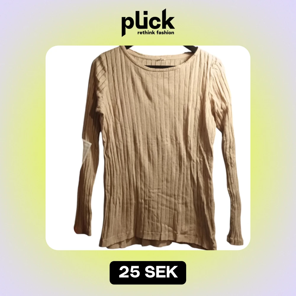Säljer en beige ribbad tröja med långa ärmar. Perfekt för en avslappnad stil och passar bra till jeans eller kjol. Tröjan har en enkel design med rund halsringning.