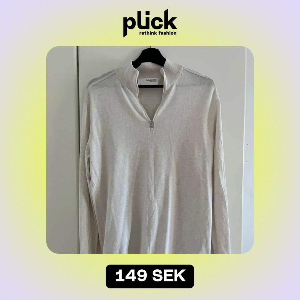 Säljer en stilren vit långärmad tröja från Selected Homme. Tröjan har en dragkedja vid halsen och är tillverkad i ett mjukt material. Perfekt för en avslappnad och snygg look.