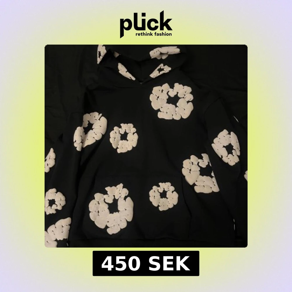 Säljer en svart hoodie från Denim Tears med ett unikt mönster av vita blommor. Hoodien har en klassisk passform med en stor ficka framtill och en bekväm huva. Perfekt för att ge din outfit en cool touch.