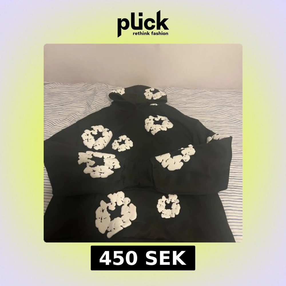 Säljer en svart hoodie med stora vita blommor tryckta över hela tröjan. Hoodien har en klassisk passform med huva och långa ärmar. Perfekt för dig som vill sticka ut lite extra med ett unikt mönster.