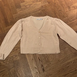Krämvit cardigan från Gina tricot - Snygg krämvit kofta med två stora bruna knappar framtill. Koftan har v-ringning, lång ärm och lätt figursydd passform. Använd kanske 2 gånger.
