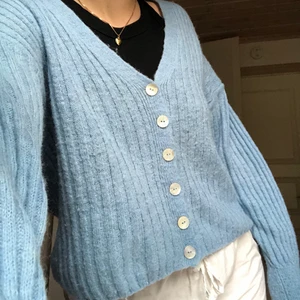 Blå kofta med pärlemorknappar