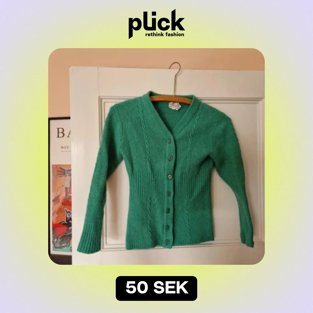 Mysig kofta i snygg grön färg som tyvärr blivit för liten för mig i tvätten, motsvarar en XS skulle jag säga!