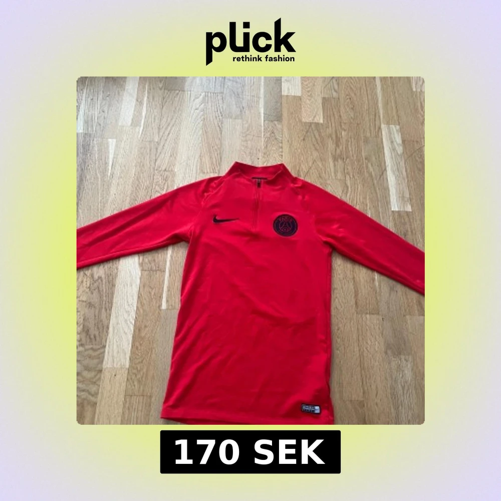 Säljer en röd långärmad fotbollströja från Nike med Dri-FIT-teknologi. Tröjan har en halv dragkedja och PSG-logga på bröstet. Perfekt för fotbollsträning eller som supportertröja. 🏟️