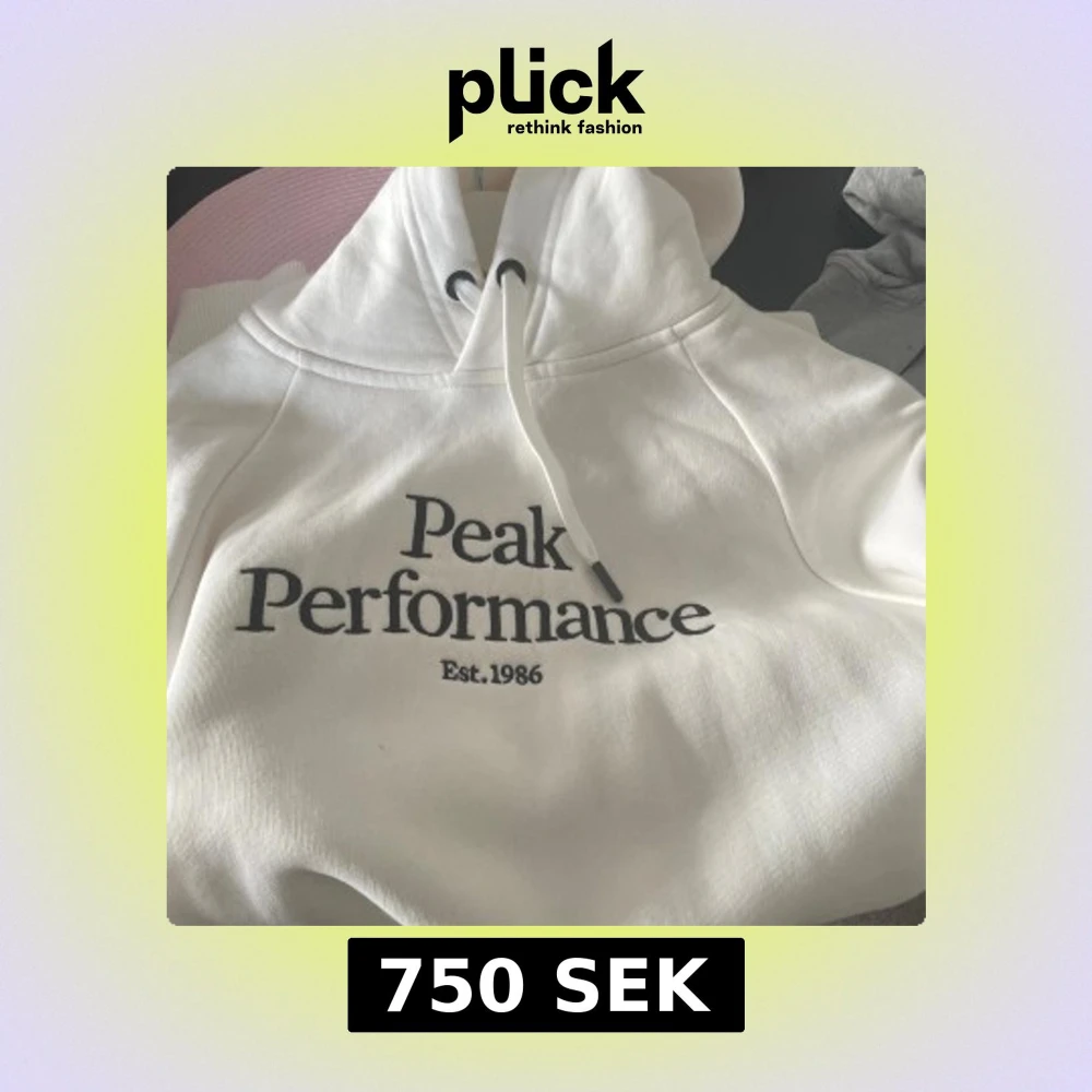 Säljer en vit hoodie från Peak Performance med svart logga framtill och snörning i huvan. Klassisk och stilren modell i mjuk bomull, perfekt för chill dagar eller när du vill ha en clean look.