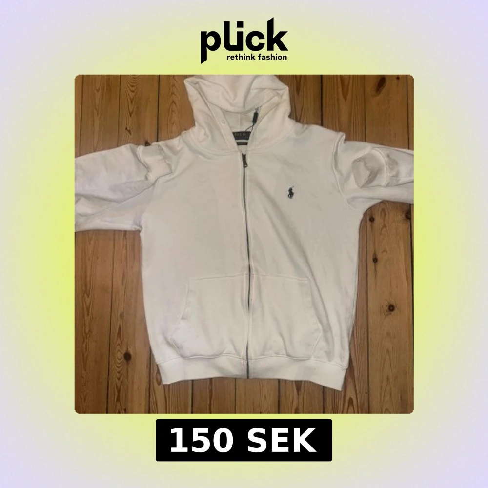 Säljer en vit hoodie från Ralph Lauren med dragkedja framtill och klassisk broderad logga på bröstet. Tröjan har huva, långa ärmar och två fickor framtill. Perfekt för en avslappnad och stilren look. Ops är FA-Ke