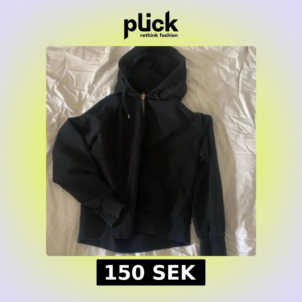 Säljer en klassisk svart hoodie med dragkedja och huva. Perfekt för en avslappnad stil och enkel att matcha med andra plagg. Den har långa ärmar och ribbade muddar vid ärmslut och nederkant.