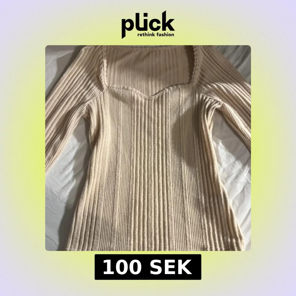 Säljer en stilren beige ribbad tröja med långärmad design. Tröjan har en fyrkantig halsringning och är perfekt för en elegant look. Passar bra till både jeans och kjol.