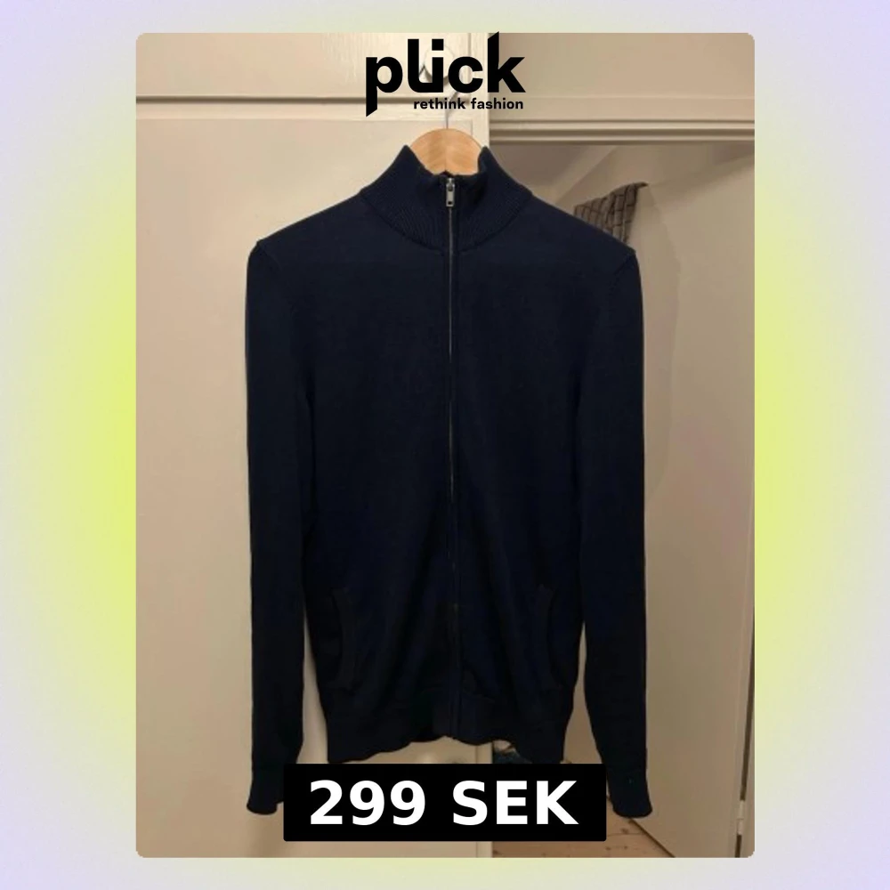Mörkblå stickad ziptröja från Pier One med hög krage och hel dragkedja framtill. Tröjan har två fickor och ribbade muddar vid ärmslut och nederkant. Perfekt för lager-på-lager och enkel att matcha med andra plagg.