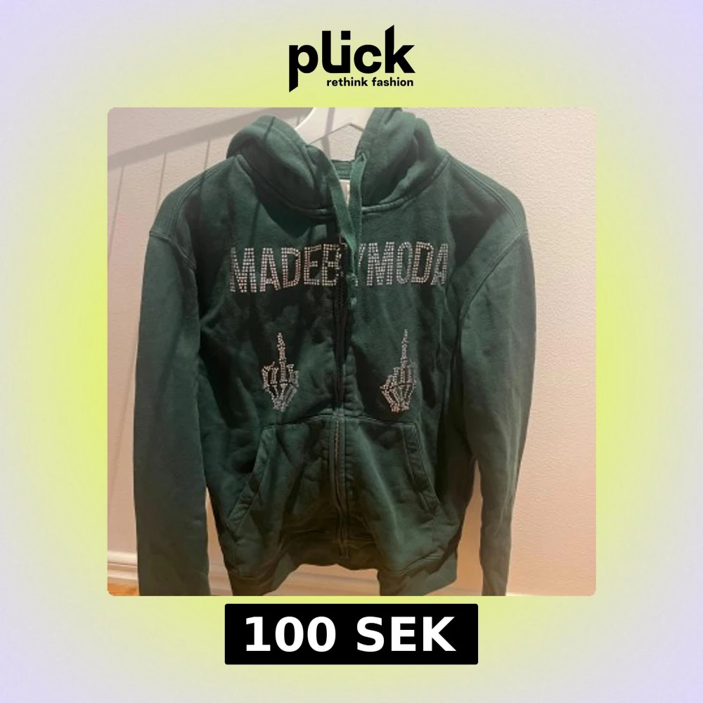 Mörkgrön hoodie från MADEBYMODA med dragkedja och huva. Framsidan har stora strasstenar som bildar texten MADEBYMODA och två skelett-händer i strass. Mjuk bomullskänsla och långa ärmar. Perfekt för dig som gillar statement-plagg.
