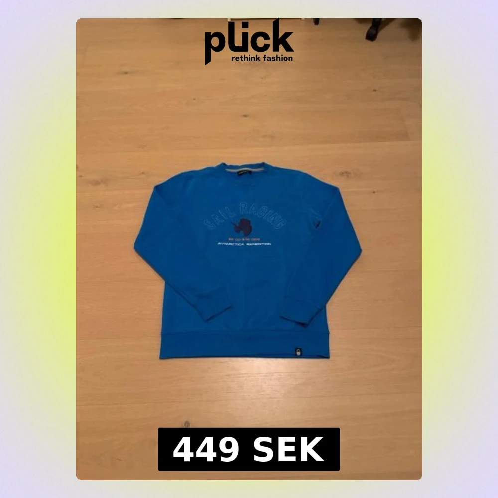 Blå sweatshirt från Sail Racing i storlek L. Tröjan har tryck med texten 'SAIL RACING Antarctica Expedition' och en siluett av Antarktis på bröstet. Mjuk insida, ribbade muddar och klassisk rund hals. Perfekt för dig som gillar stilren och clean look
