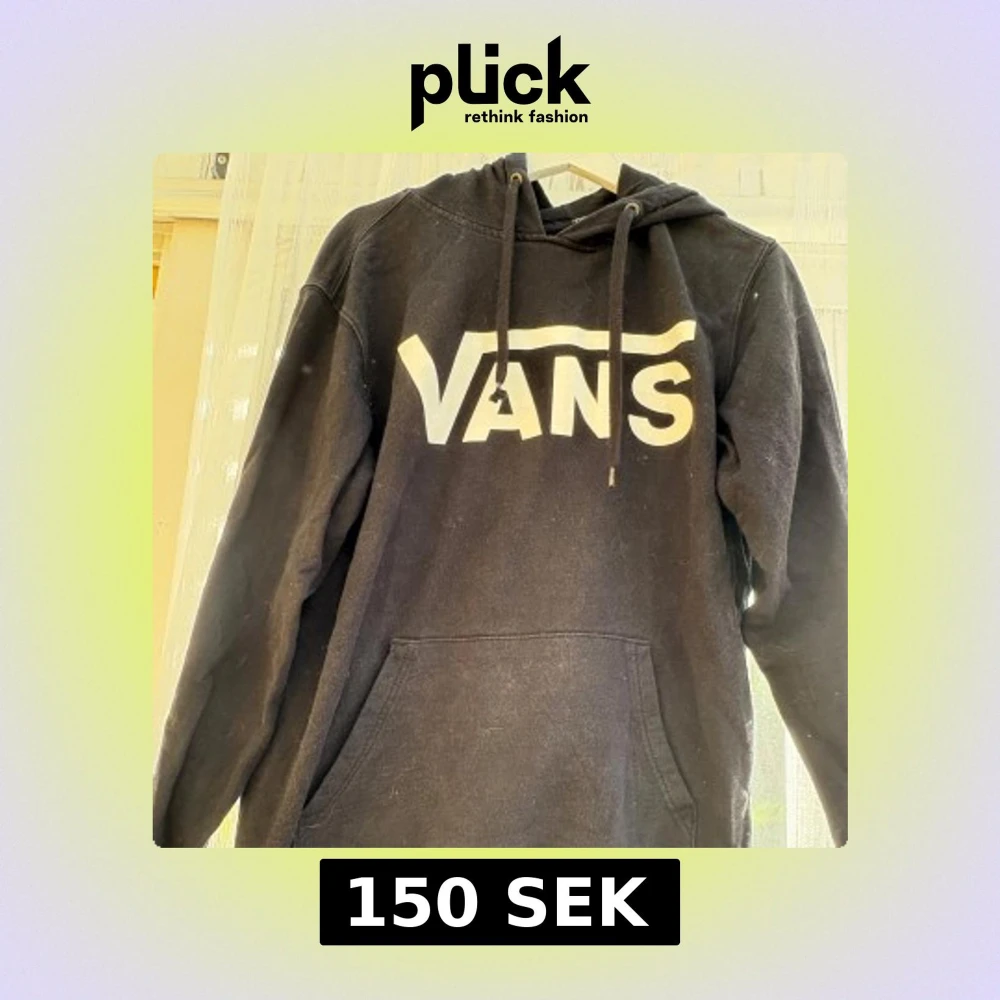 Svart hoodie från Vans i storlek small med stor vit Vans-logga framtill. Klassisk känguruficka, huva med snörning och långa ärmar. Perfekt för en chill och avslappnad stil. Solen ligger på därav den blekta effekten hamnade på magen.