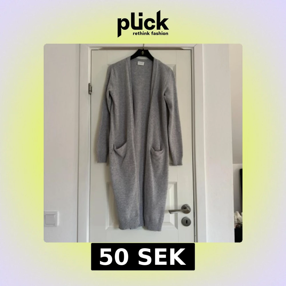 Säljer en stilren och lång grå kofta från Vila. Den har långa ärmar och praktiska fickor framtill. Perfekt för kyliga dagar och att mysa i hemma. Passar till många olika outfits!