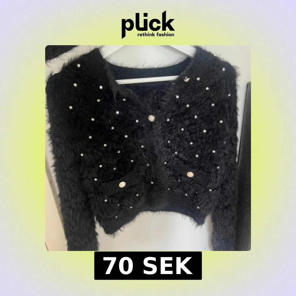 Supermjuk och fluffig svart kofta med långa ärmar, dekorerad med pärlliknande knappar och glittrande paljetter över hela framsidan. Två små fickor framtill och croppad passform. Perfekt för dig som vill sticka ut med en cozy men glam look.