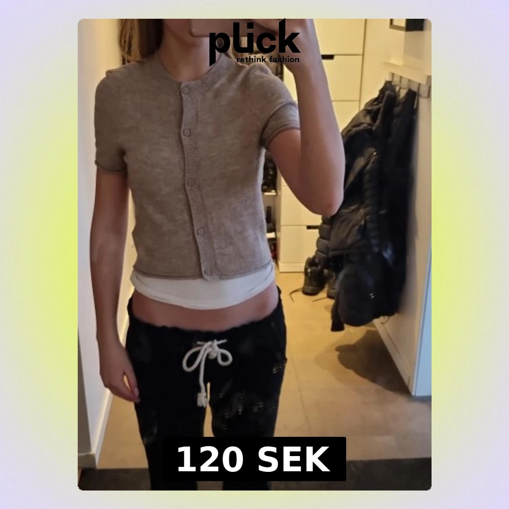 Kortärmad beige kofta från H&M Divided i storlek XXS. Tröjan har rund hals, ribbade kanter och knappar framtill. Perfekt till lager på lager och enkel att styla med olika outfits.