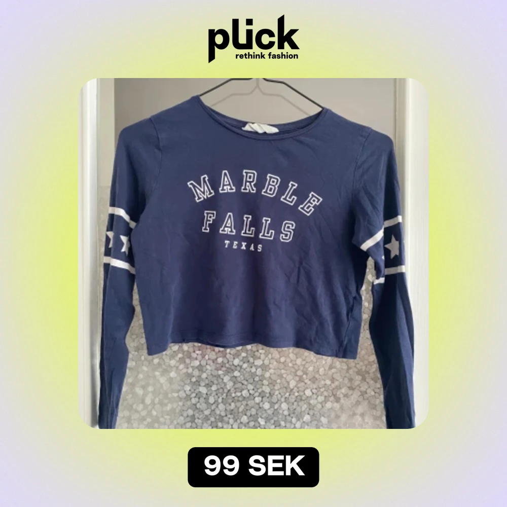 Säljer en blå croppad tröja med texten 'Marble Falls Texas' på framsidan. Tröjan har långa ärmar med vita ränder och stjärnor på ärmarna. Perfekt för en avslappnad och cool look! 💙