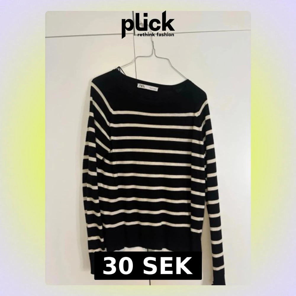 Säljer en svart och vit långärmad tröja från Zara i storlek S. Tröjan har ett klassiskt horisontellt randigt mönster och är tillverkad i mjukt stickat material. Perfekt för dig som gillar enkel och stilren design med en chill vibe.