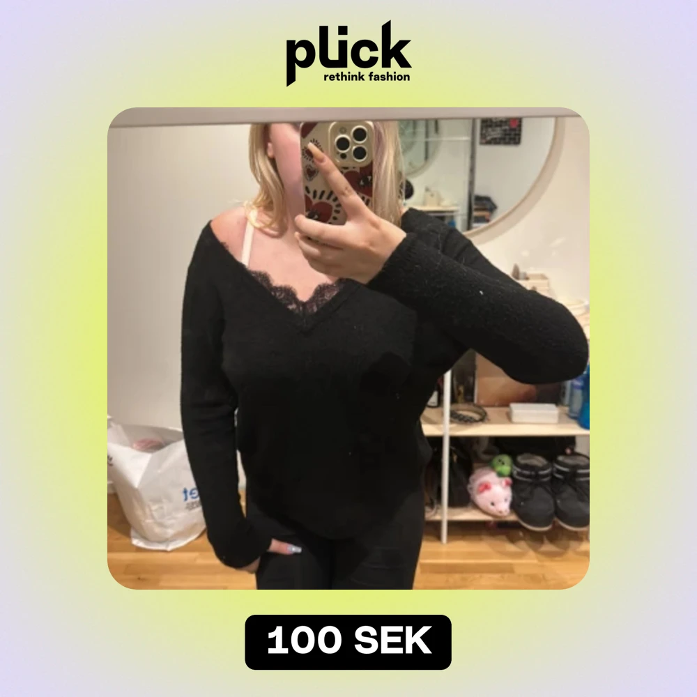 En Svart tjock tröja med v ringen som har spets. Tröjan är lite smutsig från att ha varit i min garderob men den har bara varit använd 1 gång Den är lite stickig