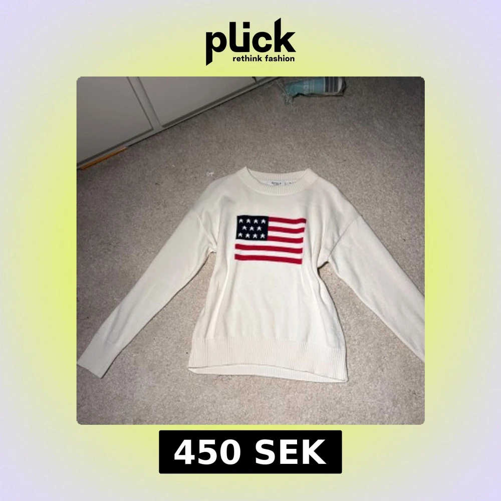 Vit stickad tröja från RYVLS med lång ärm och ribbade muddar. På bröstet finns en stor USA-flagga i blått, rött och vitt som ger en cool och preppy vibe. Perfekt till jeans eller kjol för en avslappnad look.