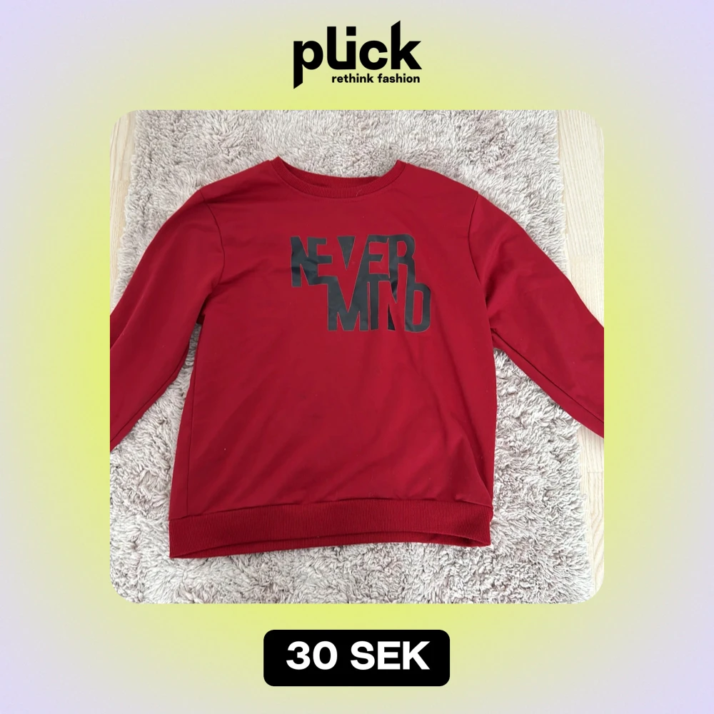 Säljer en cool röd sweatshirt med texten 'NEVER MIND' i svart på bröstet. Tröjan har en avslappnad passform och är perfekt för både vardag och chill. Den är i mycket bra skick och redo för en ny ägare. Perfekt för höst och vår!