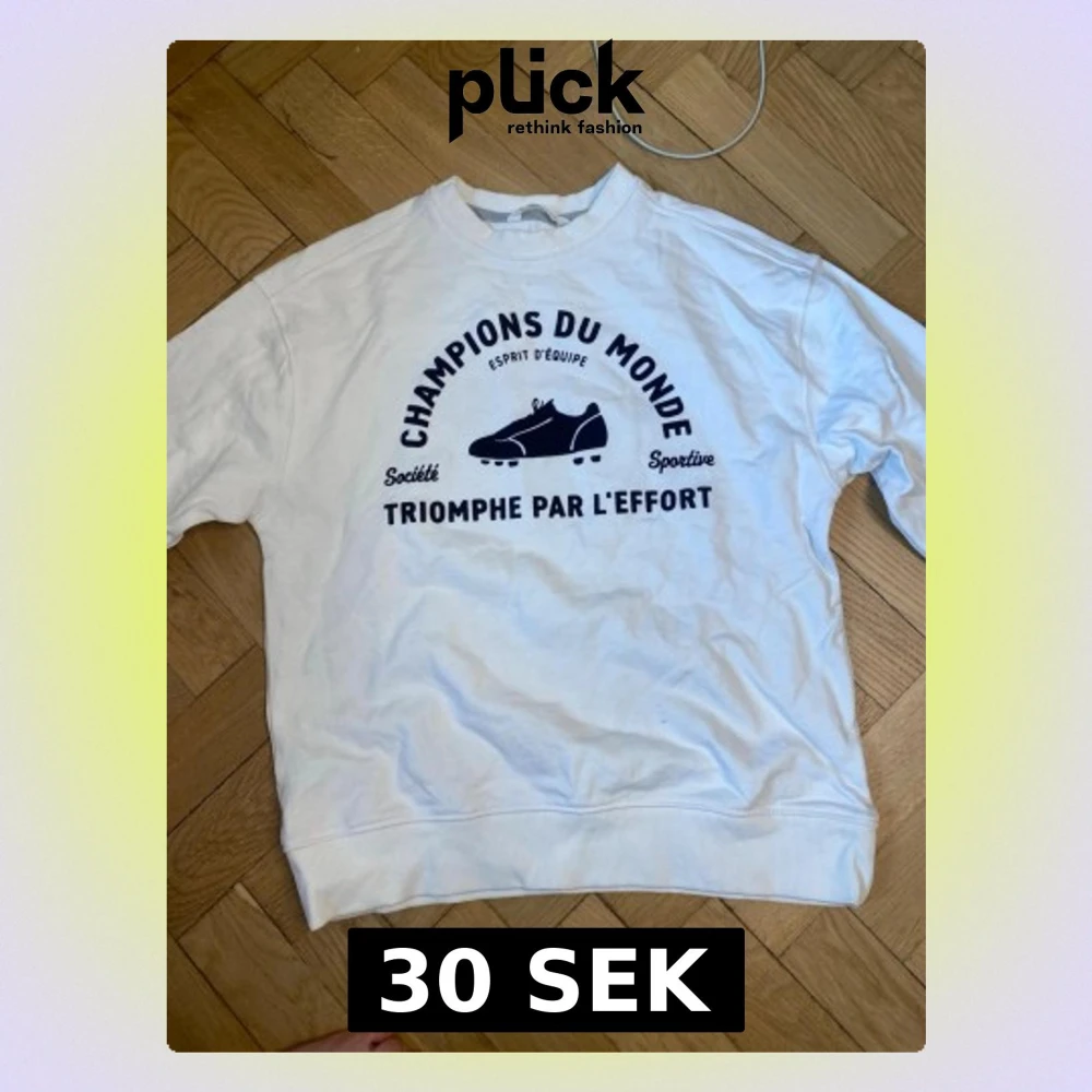 Vit sweatshirt från MNG med svart tryck på bröstet som har texten 'Champions du Monde' och en fotbollssko. Tröjan har rund hals, ribbade muddar och är gjord i mjukt material. Perfekt för dig som gillar sportiga och coola plagg.
