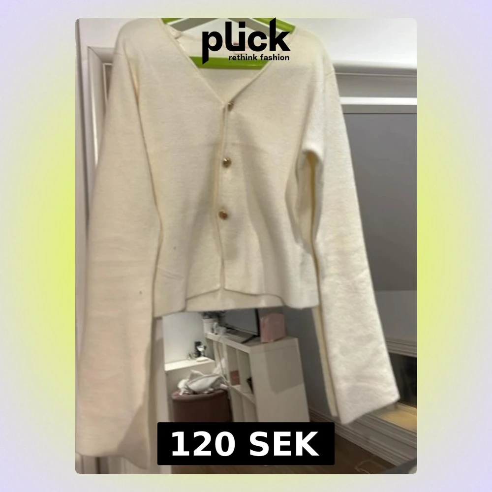 Stilren vit kofta med v-ringning och tre bruna knappar framtill. Koftan har långa ärmar och rak passform, perfekt för lager på lager. Materialet ser mjukt och bekvämt ut, vilket gör den enkel att matcha till olika outfits.