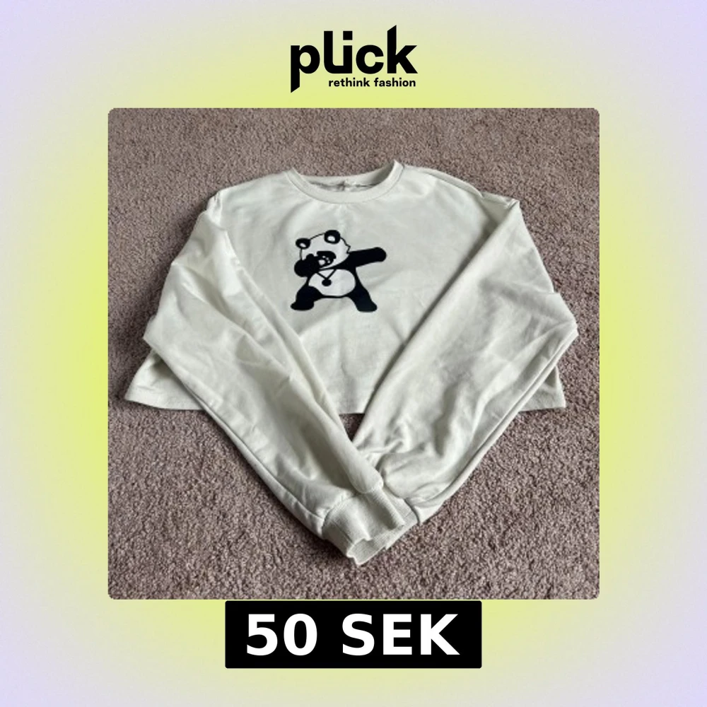 Säljer en vit croppad tröja med ett coolt panda-tryck på framsidan. Tröjan har långa ärmar och en avslappnad passform. Perfekt för en avslappnad stil!